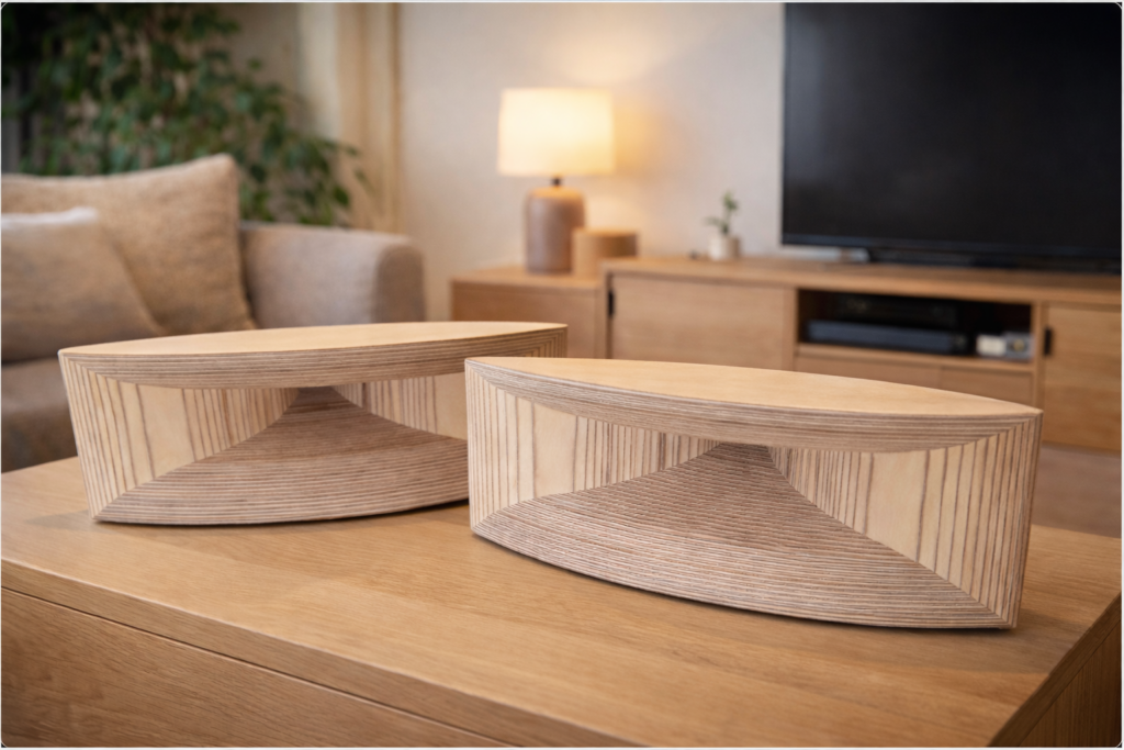 Pavillon pour moteur 2 pouce Pavillon usinés pleine masse Cotés usinés pleine masse Ideal pour Bas medium / Haut medium Coupure de fréquence recommandé 300 Hz Dimensions: L= 996 mm H= 320 P=565 mm Poids: 40 Kg pièce Multiplis Bouleau Piece de mise Bi-matière Prix public à la paire : Finition brut ponçage fin : 3400 […]